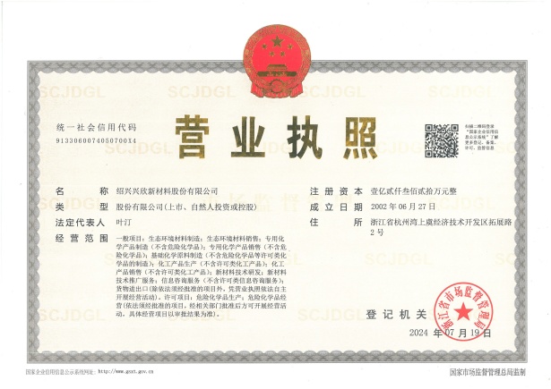 紹興興欣新材料股份有限公司成立于2002年06月27日,占地面積122畝,位于杭州灣上虞經濟技術開發(fā)區(qū)拓展路2號,現(xiàn)有職工200余人,專業(yè)技術人員50余人;博士、碩士研究生30余人組成的一支知識型、專業(yè)化的技術科研團隊。公司面向全球市場,專業(yè)開發(fā)電子化學品、環(huán)保化學品、醫(yī)藥中間體、高分子材料等先進新材料重點領域的省級科技型企業(yè);建有浙江上虞、安徽東至兩個生產基地。目前為“國家高新技術企業(yè)”、浙江省“隱形冠軍”企業(yè)、浙江省專精特新中小企業(yè);建有“省級”研究開發(fā)中心,共建天津大學浙江紹興研究院電子化學品研發(fā)中心。
